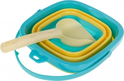 Questo set da sabbia per bambini è pensato per il divertimento all’aperto e in acqua. Il secchiello pieghevole occupa pochissimo spazio nello zaino o nel passeggino, ma una volta aperto offre un volume sufficiente per giocare con la sabbia. La combinazione di plastica e silicone è piacevole al tatto e sicura per i bambini.