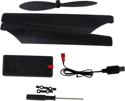 - Elicottero RC, radiocomando, caricatore USB, elica di ricambio, cacciavite, manuale d'uso, confezione originale
