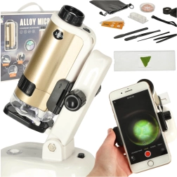 Il microscopio è costruito su una base stabile con una lampada LED, che garantisce un'illuminazione uniforme. Grazie a due livelli di ingrandimento – 100x e 250x – è possibile osservare strutture di fibre, cellule e altri materiali nei minimi dettagli.