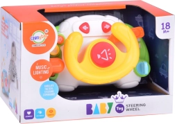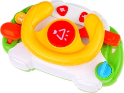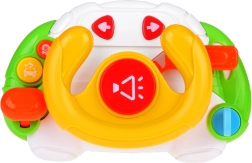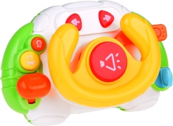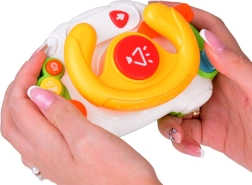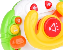 Il volante è progettato per entrare facilmente nel passeggino o nella borsa da viaggio. Grazie ai pulsanti intuitivi, i bambini imparano subito a usarlo: pulsante rosso per il clacson, giallo per le melodie (3 tipi) e blu per suoni e musica (4 tipi). Durante la riproduzione della musica, il centro del volante si illumina a ritmo.