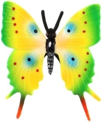 Decorativa farfalla di plastica a forma di macaone in tonalità di verde e giallo, lunga 5,5 cm, completa perfettamente addobbi, scrapbook e giochi per bambini. Ha ali finemente lavorate con motivo evidente e un aspetto molto realistico. Ideale per decorazioni, creazioni artistiche, attività educative e allestimenti a tema.