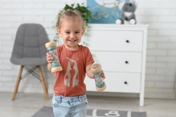 Le estremità in legno del giocattolo presentano una bella illustrazione di un pulcino, che contribuisce al suo aspetto estetico complessivo. Questo giocattolo sensoriale può essere utilizzato dai più piccoli per sviluppare abilità motorie e coordinazione.