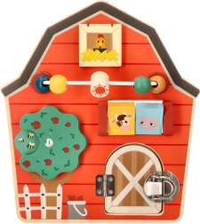 Questa lavagna attiva in legno a forma di fienile è progettata per stimolare la motricità fine e il divertimento nei bambini. Con un tema di fattoria colorata e vivace, non solo educa ma intrattiene anche i membri più piccoli della famiglia. Gli elementi interattivi come perline scorrevoli, albero rotante e porticine con serratura aiutano a sviluppare la coordinazione mano-occhio.