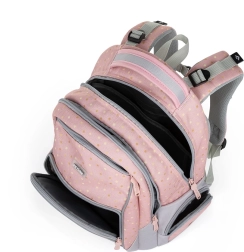 La pratica organizzazione include due scomparti interni per libri e quaderni, numerose tasche più piccole per gli oggetti, due tasche laterali (una con zip e una aperta) e ganci aggiuntivi per fissare cinghie più lunghe. Gli elementi riflettenti aumentano la visibilità del bambino nel tragitto da e verso la scuola.