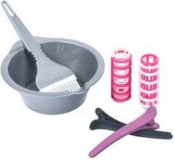 Ciotola, pennellino, clip e bigodini stimolano la fantasia durante la “tinta” e la messa in piega. In sicurezza e senza disordine.