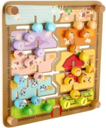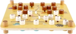 Uno strumento intelligente e divertente per i prescolari: la tavola a doppia faccia nasconde due mondi. Nella fattoria i bambini spostano i piolini con animali, faccine e frutta lungo le piste fresate fino alla loro posizione. Girando la tavola, si trasforma in un labirinto dell’alfabeto – il compito è portare il piolino con la lettera iniziale all’animale corretto (i nomi sono in inglese), così si esercitano in modo giocoso lettere e vocabolario.