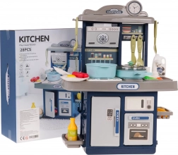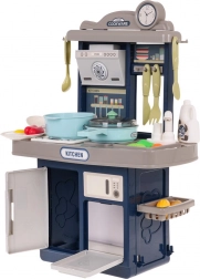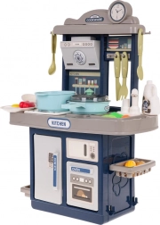 Elegante cucina per bambini in colore blu con effetti luminosi e sonori, acqua corrente dal rubinetto e un ricco set di 35 accessori per un gioco di cucina realistico. Struttura robusta, piano cottura interattivo con retroilluminazione e suoni di frittura e bollitura, forno e frigorifero apribili stimolano il gioco creativo e lo sviluppo dell'immaginazione dei bambini a partire dai 3 anni.