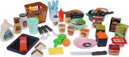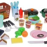 - grande cucina, .- lavagnetta, .- gessetti, .- spugna, .- pentola con coperchio, .- padella con coperchio, .- cestino, .- ciotola, .- 2 x tazza, .- teiera, .- saliera, .- 2 x barattolo spezie, .- pepiera, .- salsa di soia, .- salsa piccante, .- salsa agrodolce, - ketchup, .- 2 x marmellata, .- 2 x sandwich, .- 2 x piatto, .- 1 x piatto da portata, .- cetriolo, 5 fette di peperone, banana, 2 fette di carota, carota, 2 foglie di lattuga, 2 x piselli, 2 fette di cipolla, 2 pezzi di broccoli, mais, patata, pera, .- cucchiaio, forchetta, coltello, .- mestolo, scolapasta, spatola, cucchiaio per pasta, mannaia, .- detergente per i piatti, .- cartoni di latte, succo, biscotti, hamburger, hamburger, .- set di adesivi. . |