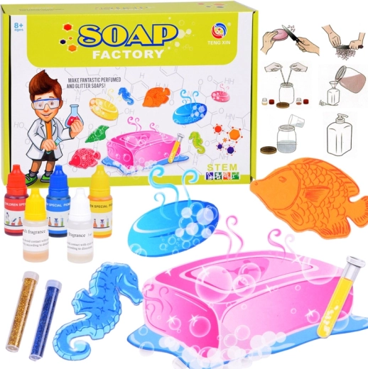 Se il tuo bambino impara meglio giocando o stai cercando un modo interessante per trascorrere il tempo, la produzione di sapone sarà la scelta ideale! Crea saponi profumati e impara la chimica! Il processo di creazione è semplice e sicuro – i bambini apprendono le regole di base su come funziona il sapone e varie tecniche di produzione artigianale. Utilizzando la base di sapone, fondendola, mescolandola con il colore scelto e successivamente versandola negli stampi, si creano saponi colorati e belli di forme uniche. Il set include anche aromi, grazie ai quali ogni sapone può avere un profumo diverso.