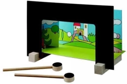 basi di supporto; 2 scenografie; 2 bacchette di guida; 5 figurine in legno