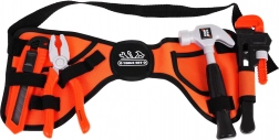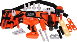 - Cintura porta-attrezzi regolabile; trapano; 3 bit intercambiabili per il trapano; adattatore per cacciavite; 2 bit intercambiabili per il cacciavite; pinze; chiave regolabile; coltello; martello; 2 pezzi per avvitare; 1 pezzo “in legno”; 2 viti; 2 bussole; 4 tasselli