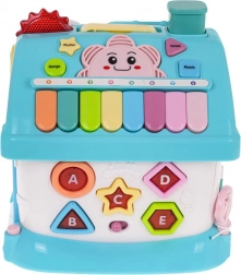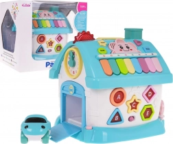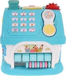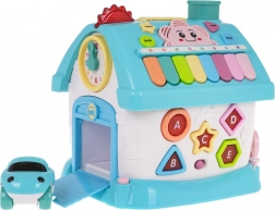 La casetta interattiva è realizzata in plastica di qualità con colori accattivanti ed è progettata per far sviluppare in modo divertente il riconoscimento di forme, lettere e numeri. Ognuno dei quattro lati offre attività diverse: dall’orologio con lancette realmente mobili e la porta del garage, alla parete con alfabeto e forme retroilluminate, fino alla porta d’ingresso con chiave con luci e suoni. Inclusa anche una piccola automobilina per ancor più scenari di gioco.