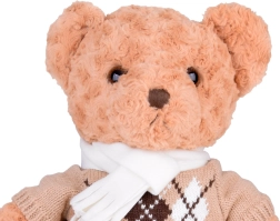 Il maglione dell'orsetto con motivo argyle e la sciarpa color crema donano al giocattolo un aspetto elegante. Questi accessori non solo ne aumentano il valore estetico, ma ne sottolineano anche l'eleganza.