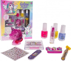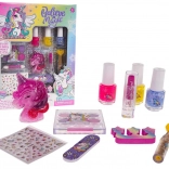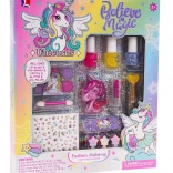 Contenuto della confezione: 3× smalto glitter, rossetto, applicatore con glitter, limetta per unghie con unicorno, separadita, palette di ombretti (6 colori) con pennellino, gloss per labbra in scatolina a forma di unicorno, adesivi decorativi per unghie.