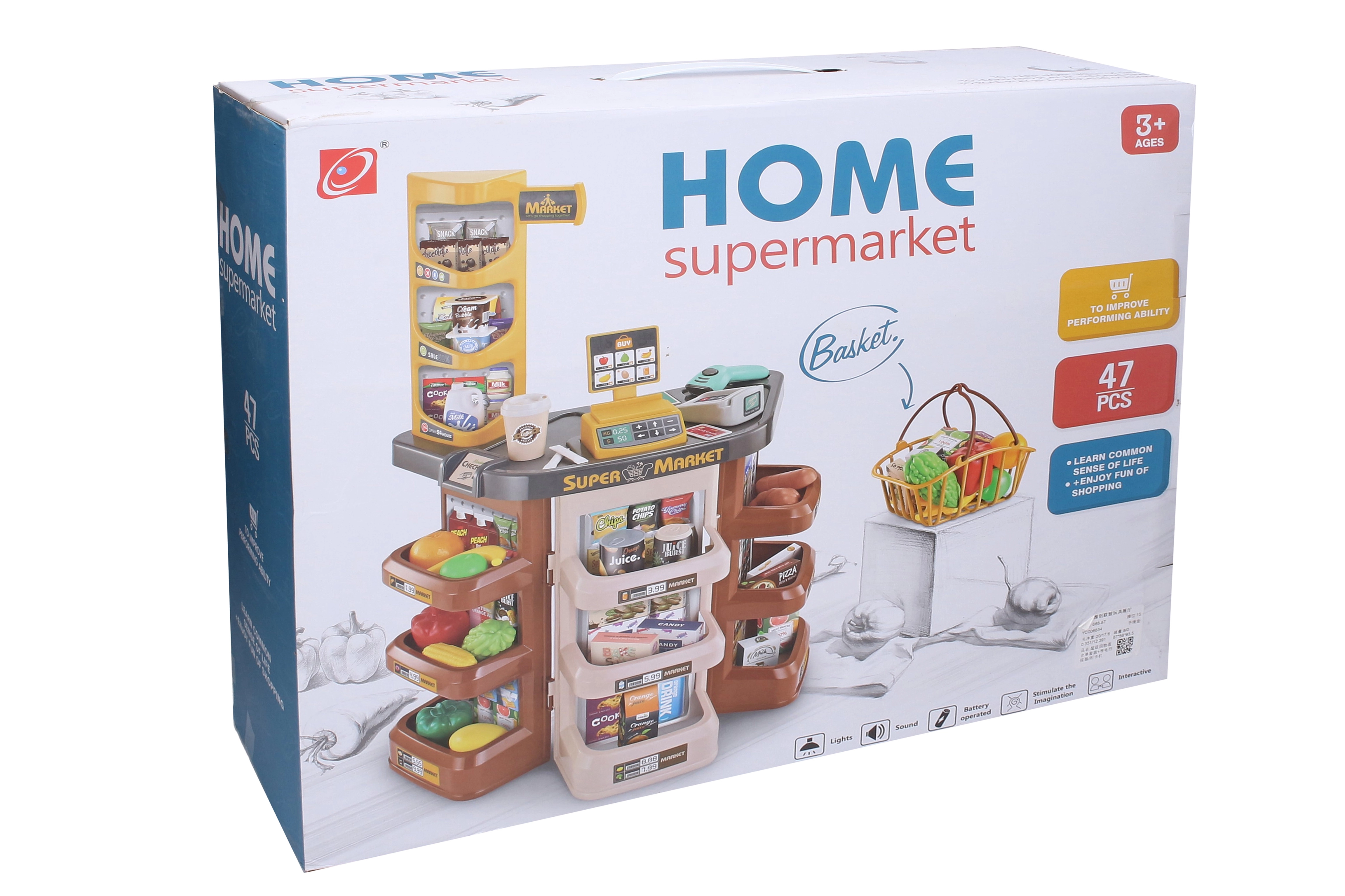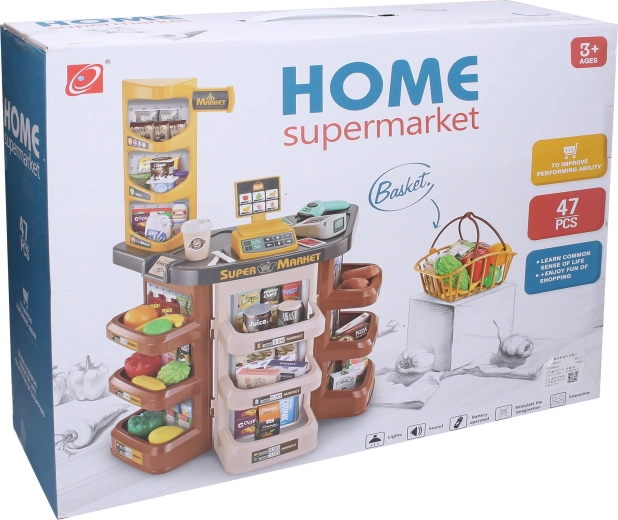 Il set include supermercato con banco, cassa, lettore di codici a barre, terminale di pagamento e carta di pagamento. Non mancano banconote, monete, cestino della spesa e una ricca selezione di alimenti come frutta, verdura, latte, caffè, succo, biscotti, pizza e nocciole. Sul lato inferiore della confezione si trova un’istruzione illustrata per un facile montaggio.