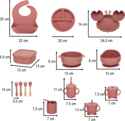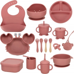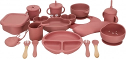 Set completo di stoviglie in silicone per bambini in colore rosa scuro che include piatti, ciotole, tazze e posate. Le stoviglie sono realizzate in silicone sicuro, facili da pulire e ideali per l'apprendimento dell'alimentazione autonoma.