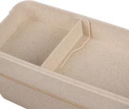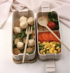 Nella confezione è incluso anche un set di posate in paglia di grano. Questi strumenti pratici includono un cucchiaio e una forchetta con bordo ondulato da usare come coltello. Le posate si posizionano facilmente all'interno del lunchbox, garantendo di averle sempre a portata di mano.
