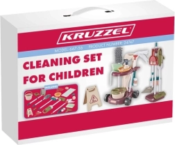 Carrellino con manico ergonomico - il carrellino su quattro ruote larghe, realizzato in plastica PP di alta qualità, è stato progettato per muoversi con facilità. L’ampia impugnatura ergonomica facilita ai bambini la guida del carrello anche durante il gioco in movimento. Su due ripiani è possibile posizionare vari elementi del set: il secchio con cestello strizzatore per il mocio sul ripiano inferiore e la bacinella, il tappetino, lo strizzatore e il portasapone su quello superiore. Grazie ad apposite aperture si possono collocare nel carrello la scopa tonda spolvera, la spugna e il mocio, permettendo un facile accesso a tutti gli strumenti. Ai lati del carrello sono presenti due ganci per appendere il panno in microfibra.