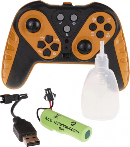 L'escavatore è alimentato da una batteria da 3,7 V 800 mAh (inclusa), mentre il telecomando richiede 2 batterie AA (non incluse). Sono inclusi anche un cavo di ricarica USB e un pipetta di plastica per acqua per gli effetti di fumo.