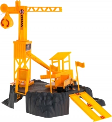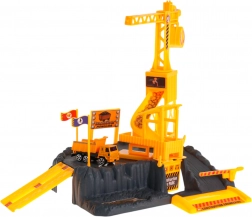 Gru con area di cantiere, macchinina da cantiere, sbarra, parapetto, 6× coni, bandierine, segnali stradali