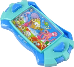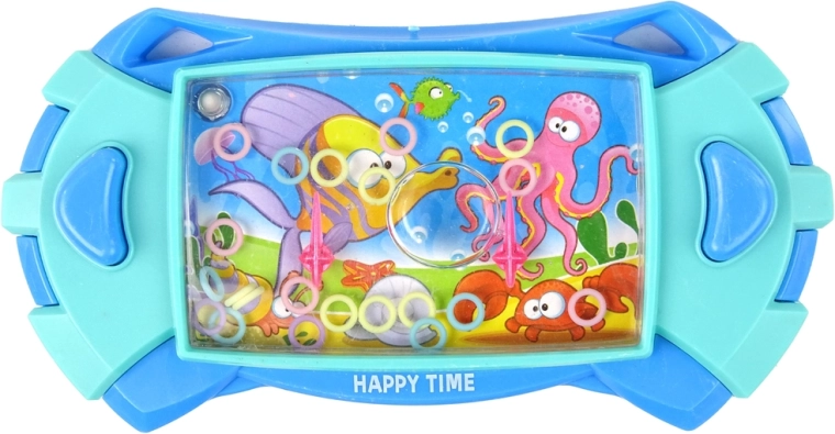Questo gioco d'acqua è a forma di console con tonalità di blu e grafica del mondo sottomarino all'interno. Le immagini includono un polpo, un gambero e un pesce, creando un'esperienza visiva coinvolgente.