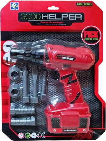 Questo set include un trapano a batteria realistico, che non solo sembra reale, ma si gira anche e emette suoni autentici di perforazione quando si preme il pulsante. Include punte e viti intercambiabili, aggiungendo realismo al gioco.