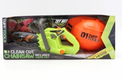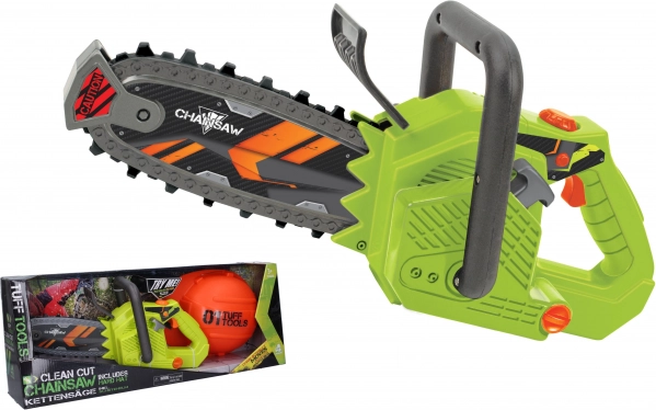 Questa motosega giocattolo Tuff Tools è ideale per i bambini che amano giocare al meccanico o al boscaiolo. Premendo il pulsante laterale la motosega “si avvia” e il grilletto attiva il movimento della catena e gli effetti sonori di taglio, che rendono il gioco ancora più autentico.