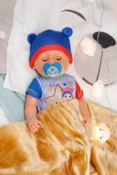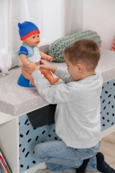 Vi presentiamo Jonas! La bambola Jonas, conosciuta dalla serie animata BABY born che puoi guardare in ceco sul canale BABY born su YouTube, ora può essere tua anche a casa. Con un nuovo completino e 10 accessori. Porta con sé anche un piattino magico: quando metti un po’ d’acqua nel piatto con la placca bianca all’interno, sulla placca appare un delizioso cibo con un visetto carino, che rende ancora più divertente dare da mangiare alla bambola. Dopo aver dato da mangiare a Jonas (con acqua) o dopo che ha bevuto dal biberon, se lo metti sul vasino e gli premi il pancino, sulla placca del vasino compare l’immagine di pipì e popò. Quando Jonas beve acqua dal biberon, può versare lacrime e ha bisogno di essere consolato. Può aiutare il ciuccio magico: se lo giri di 180 gradi nella bocca, gli occhietti si aprono o si chiudono. Giralo di nuovo e accade il contrario. Ma Jonas sa fare ancora di più: ha articolazioni mobili e puoi portarlo anche nella vasca da bagno. Ora asciuga persino più in fretta di prima: per pulire bene la bambola dopo il gioco, è possibile rimuovere una gamba e creare così un’apertura più grande per la pulizia. In questo modo l’acqua defluisce più facilmente dalla bambola. Per un gioco ancora più interessante, oltre al biberon, al ciuccio, al piatto con la placca con l’immagine del cibo e al vasino con la placca con l’immagine di pipì e popò, Jonas porta anche un pannolino, un certificato di nascita, un foglio di adesivi e due braccialetti dell’amicizia – uno per la bambola e uno per la sua piccola mamma – a testimonianza di una lunga e affettuosa amicizia tra il bambino e la bambola.