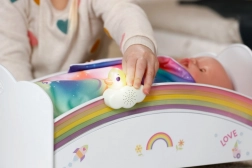 Crea per la tua bambola un angolo accogliente per dormire con l’incantevole lettino arcobaleno BABY born. Il lettino vanta delicati motivi pastello di arcobaleni e nuvolette, un materasso confortevole e un cuscino e una copertina double-face per un comfort ancora più coccoloso.