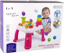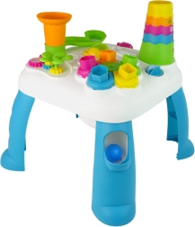 Il tavolino educativo interattivo in bianco e blu è progettato per sviluppare le abilità del bambino in modo divertente. Grazie agli effetti luminosi durante l’inserimento delle forme, agli elementi colorati e allo scivolo per palline, i bambini allenano coordinazione occhio–mano, logica e immaginazione. Le gambe removibili permettono di giocare sul tappeto o nella culla; il pannello può essere fissato al telaio della culla tramite cinghie.