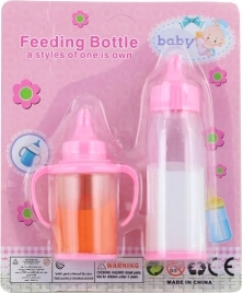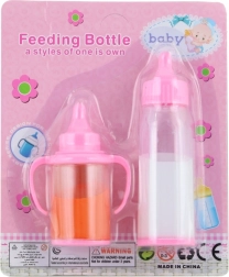 Set di biberon con cibo per bambola. Materiale: plastica. Contiene liquidi. Confezionato su cartoncino. Dimensioni 17×14×3,5 cm. Età 3+