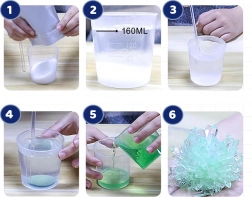 Basta mescolare la polvere per cristalli con 160 ml di acqua bollente, lasciare raffreddare a circa 45 °C, aggiungere i 'semi' del cristallo e dopo 4–7 giorni godersi cristalli originali e colorati. Tutto il necessario è nella confezione, quindi potete iniziare subito.