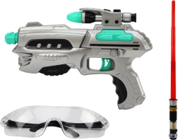 Entra nel mondo delle avventure galattiche con questo set completo per piccoli eroi. Include una pistola futuristica con effetti luce e suono, una spada luminosa estensibile fino a 80 cm e occhiali protettivi per un gioco più sicuro. Ideale per giochi creativi e d'azione dai 3 anni in su, con certificazione di sicurezza CE e norma EN71.