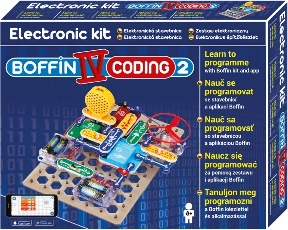 Il kit elettronico Boffin IV Coding è la scelta ideale per bambini e adulti che desiderano avvicinarsi alle basi dell’elettronica e allo stesso tempo imparare a programmare. I pezzi si inseriscono facilmente sulla base e in pochi istanti potrai costruire progetti funzionanti, dagli effetti luminosi ai circuiti sonori fino a elica volante e ventilatore. Collegando tramite il modulo U33 all’app gratuita Boffin (Google Play / App Store) potrai controllare e programmare i progetti in ceco.