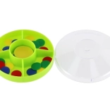 Il gioco per bambini Pulci è un gioco divertente che sviluppa la motricità fine e la concentrazione nei bambini. La confezione contiene quattro set di dischi colorati, ciascun set include cinque piccoli dischi e uno grande. Il gioco comprende anche una scatola con scomparti numerati, permettendo diverse combinazioni di gioco. L'obiettivo è utilizzare la grande pulce per far entrare tutte le piccole pulci negli scomparti della scatola.