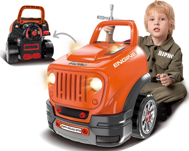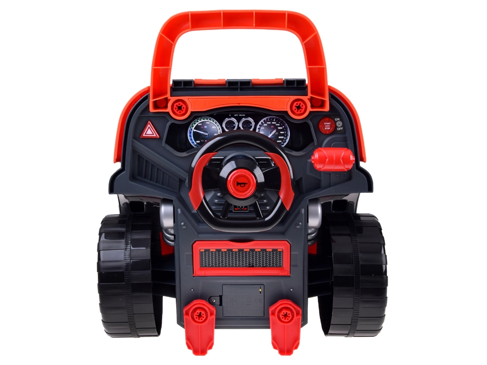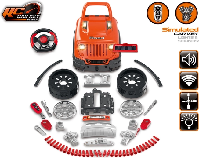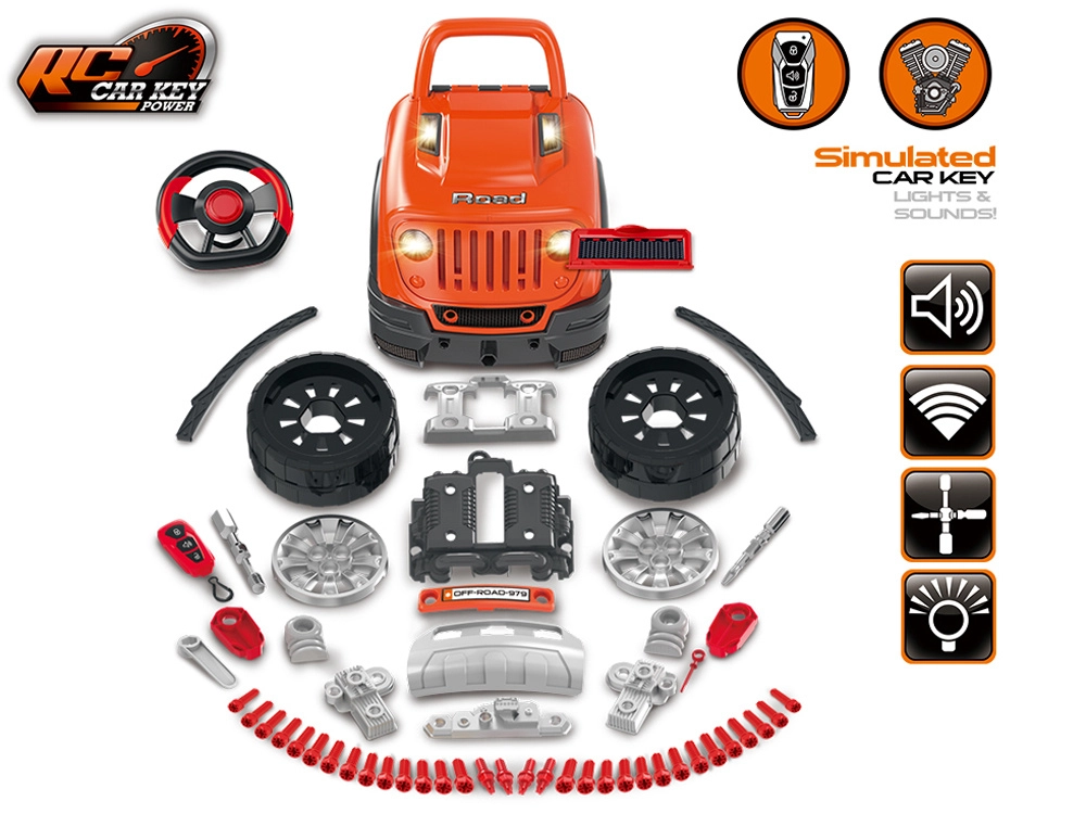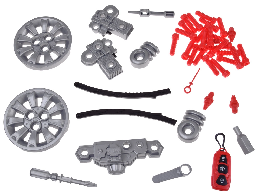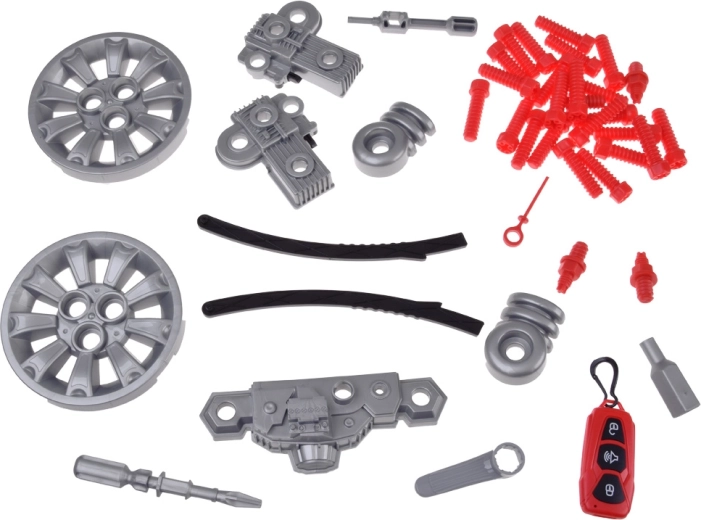 Il set include ricchi accessori: viti/bulloni, cacciavite con chiave a brugola, attrezzo a 4 vie, astina dell’olio e filtro, targa e cavalletti per “sollevare” l’auto. Il volante girevole con clacson funzionante e leva del cambio aggiunge ancora più divertimento.