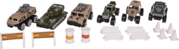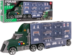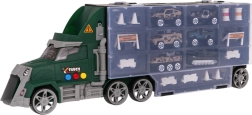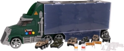 Il set include 6 macchinine tipo “resorak” in metallo/ammortizzate e ricchi accessori (coni, staccionate, barriere, barili) per creare percorsi a ostacoli e scenari militari. La pratica maniglia per il trasporto permette al bambino di portare il camion ovunque.