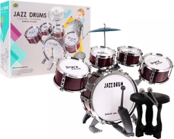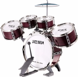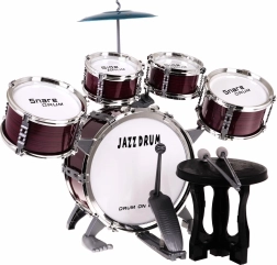 Include tutte le parti necessarie: cinque tamburi, piatto, bacchette e sgabello.