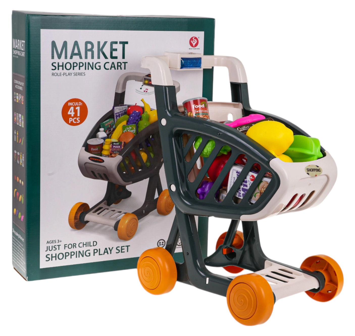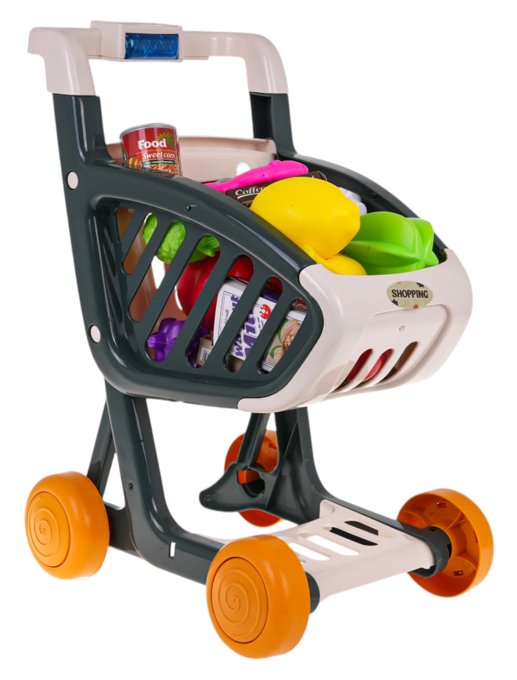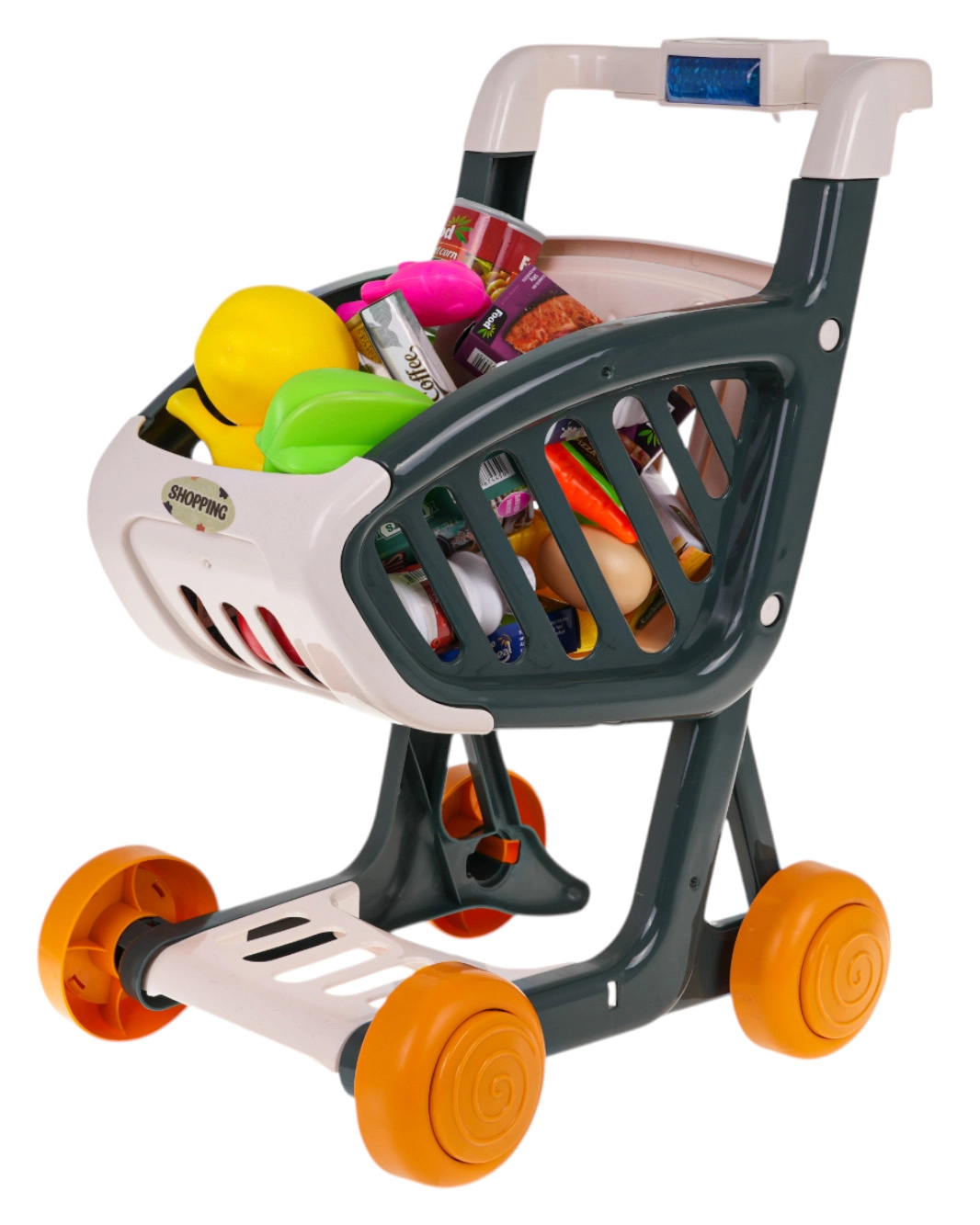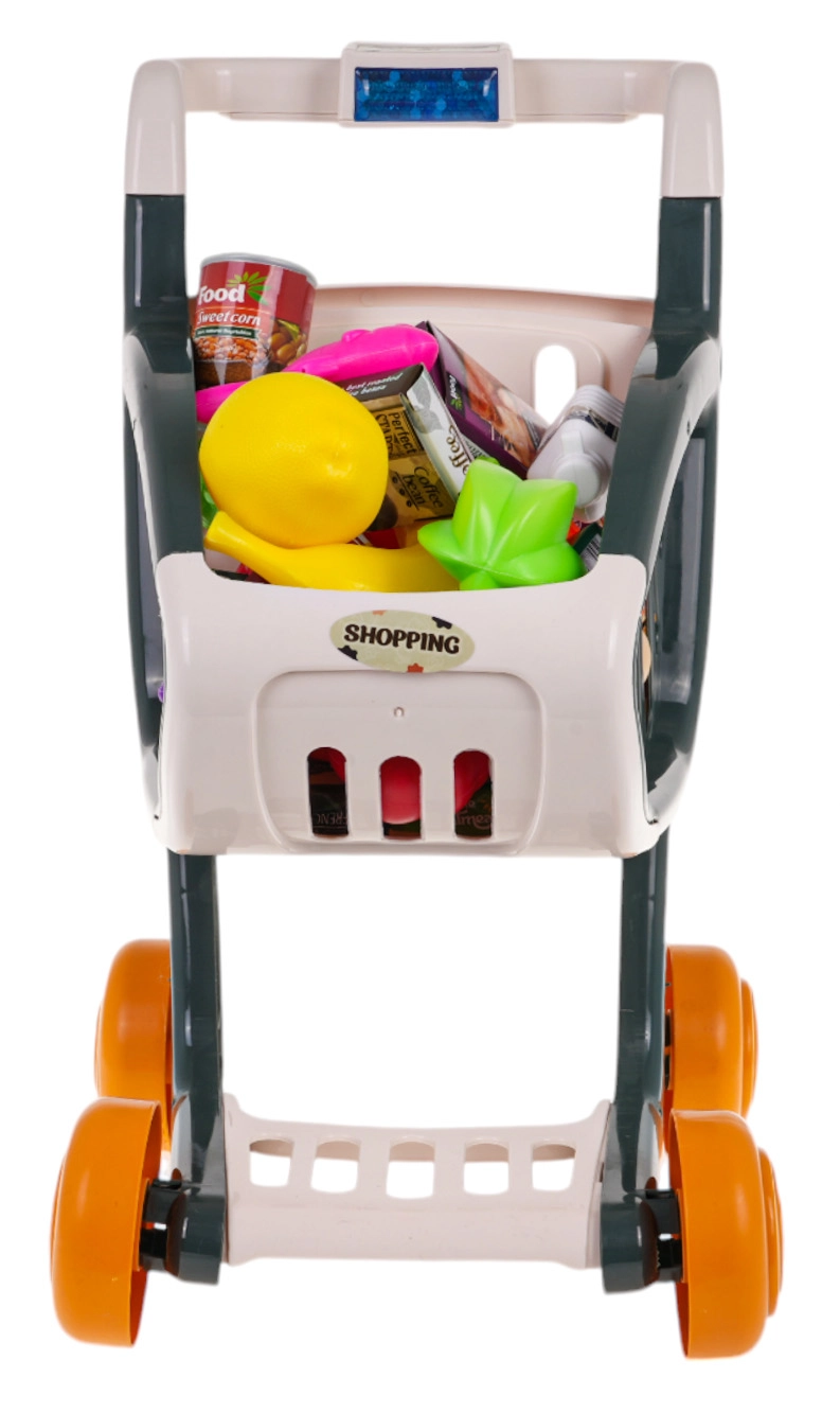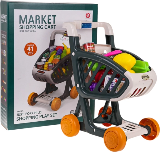 Il carrello della spesa interattivo per bambini dai 3 anni offre tanto divertimento e apprendimento. Presenta una struttura stabile, ruote piroettanti e un pannello di controllo con luci e musica. Premendo il pulsante blu si accendono LED lampeggianti (verde, rosso, blu) e partono canzoncine allegre. Inclusi 41 accessori per un gioco di shopping realistico. Batterie 3× AG13 incluse nella confezione.
