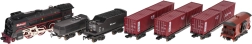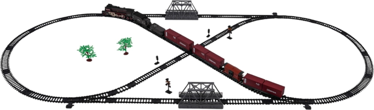 - locomotiva, .- carrozza passeggeri, .- carro carbone, - carro con pilota, - 3 x carro con container, .- componenti dei binari, .- 2 ponti, .- 2 segnali, .- 2 alberi, .- pipetta per l’acqua, .- cavo di ricarica USB, .- manuale, . |