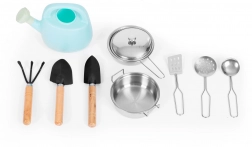 10 pz (pentola, coperchio, padella, spatola, colino, mestolo, annaffiatoio, 3× attrezzi da giardino)