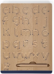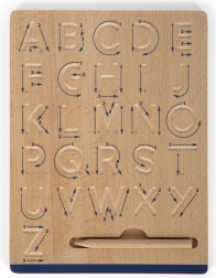 Le scanalature fresate con frecce guidano il bambino nella scrittura e fissano le corrette direzioni dei tratti per le lettere A–Z e i numeri 0–9.