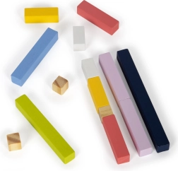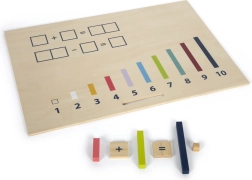 - Contenuto del set: base per contare, piccoli cubi, prismi e bastoncini colorati, pezzi in legno con numeri e segni matematici.