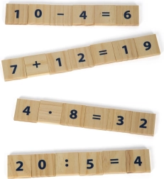 Tessere in legno con equazioni e numeri motivano i bambini a risolvere in autonomia e a ripassare rapidamente.