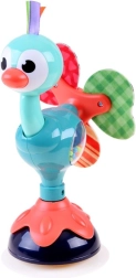 Il simpatico pavone combina parti lisce in plastica e morbidi elementi tessili sulla coda per offrire al neonato texture e stimoli diversi. Una volta fissato con la ventosa, il giocattolo ruota attorno al proprio asse e, durante il movimento, emette un delicato suono tintinnante che motiva i bambini ad afferrare ed esplorare.