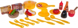 padella, pentola con coperchio, ciotola, ciotolina con coperchio, bicchiere, 3 × piatto, spatola, mestolo, coltello, forchetta, cucchiaio, posate per bambini, utensili da cucina, ketchup, dressing, saliera, scatoline per biscotti, riproduzioni di alimenti (peperone, pomodoro, piselli, lattuga, carota, gambero, uovo, wurstel, pesce)