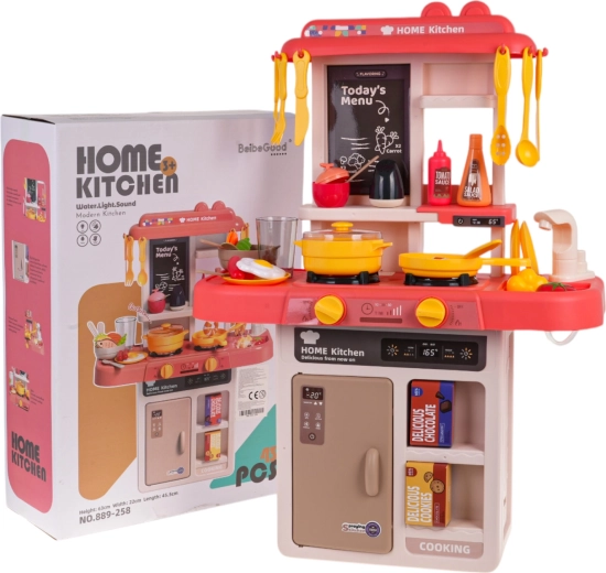 Adorabile cucina giocattolo per piccoli chef dai 3 anni con effetti luminosi e sonori, acqua corrente dal rubinetto funzionante e un ricco set di 43 accessori. Manopole realistiche, fornelli illuminati e suoni autentici di cottura e frittura favoriscono il gioco creativo e lo sviluppo dell'immaginazione.