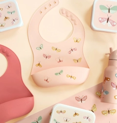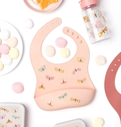 - 2× bavaglino in silicone (1× con motivo farfalle, 1× tinta unita)