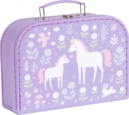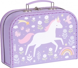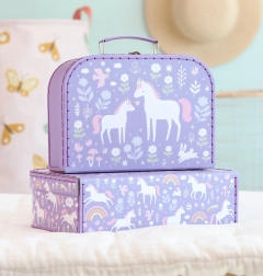 Il set di due valigette decorative di A Little Lovely Company propone un design giocoso con unicorni, arcobaleni e fiori su sfondo viola. La struttura leggera ma robusta in cartone resistente con cuciture di qualità assicura lunga durata e trasporto confortevole.