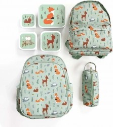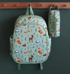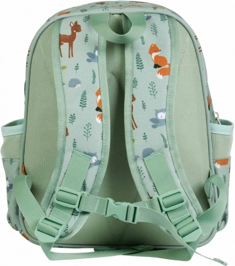 Capiente zaino verde menta con motivo di animali del bosco, ideale per l’asilo e le gite. Offre una grande scomparto principale, una tasca frontale isolata per la merenda, tasche laterali per la borraccia e spallacci imbottiti con cintura pettorale per un trasporto comodo e sicuro.